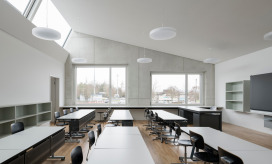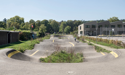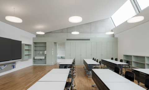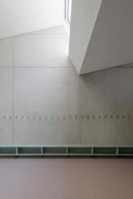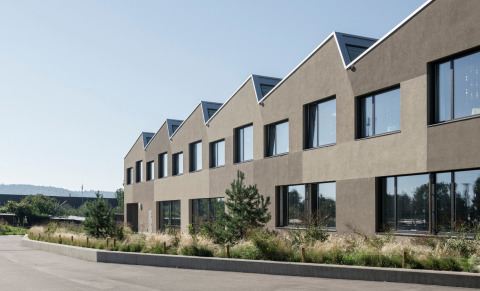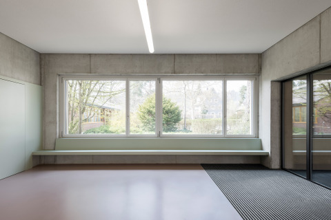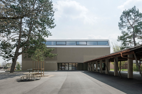 Das neue Schulhaus integriert sich auf selbstverständliche Weise in die Schulanlage aus den Fünfzigerjahren. Das niedrige Gebäudevolumen strickt das Bebauungsmuster der öffentlichen Gebäude im Schaffhauser Breitequartier weiter und nimmt das Thema der parallel ausgerichteten Dachformen auf. Die bestehende Pausenhalle konnte erhalten bleiben und verbindet den Neubau mit dem bestehenden Schulhaus. Das markante Sheddach ermöglicht im Obergeschoss Unterrichtsräume mit grosser Raumtiefe und verteilt das Tageslicht gleichmässig bis in den zentralen Erschliessungsraum. Im Erdgeschoss setzt sich die Topografie im Inneren des Gebäudes fort und schafft dadurch Bereiche mit unterschiedlichen Raumhöhen. Dank den beiden Eingängen lassen sich der Mehrzweckraum und die ausserschulischen Räume auch in Randzeiten unabhängig nutzen. Über den breiten, zentralen Erschliessungsraum werden alle Klassenzimmer und Werkräume erschlossen. Zwischen den Klassenzimmern sind die Gruppenräume angeordnet und können bei Bedarf zusammengeschlossen werden. Die Fassade ist mit einem mineralischen Kratzputz versehen. Verschiedene Farbflächen erzeugen zusammen mit den verspringenden Fenstern ein lockeres und verspieltes Erscheinungsbild.