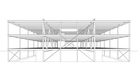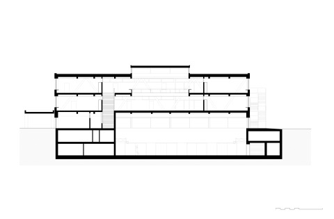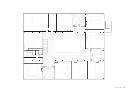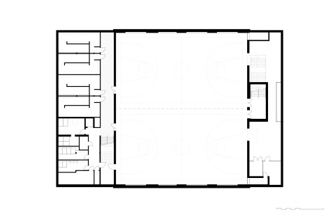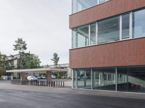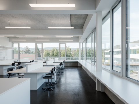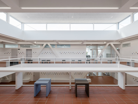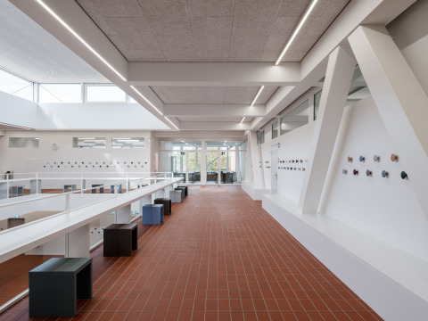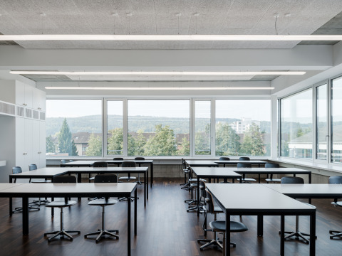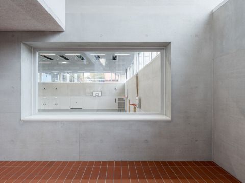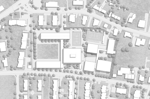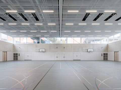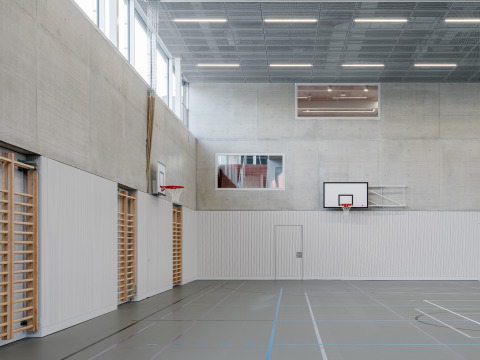 Die Gebäude der Schulanlage Dübendorf-Schwerzenbach sind in der Situation schachbrettartig angeordnet. Der Erweiterungsbau im Zentrum der Anlage ist als einfacher Körper konzipiert und reiht sich auf selbstverständliche Weise in dieses System ein. Das Schulhaus und die Turnhalle sind in einem kompakten Volumen zusammengefasst, damit ihr Fussabdruck möglichst klein bleibt und zur Strasse hin ein attraktiver Vorplatz entsteht. Die Sporthalle ist zu zwei Dritteln im Boden versenkt und wird über ein Oblichtband dreiseitig belichtet. Sie kann neben dem Sportbetrieb auch für Veranstaltungen mit bis zu 600 Personen genutzt werden. Über der Sporthalle liegt das Schulhaus; von der Eingangshalle aus führt eine Treppe in die zweigeschossige Halle hoch, welche das Herzstück der Anlage bildet. Sie ist anregender Begegnungsraum, Lernzone und erschliesst alle Unterrichtsräume. Auf der oberen Etage rahmt ein umlaufendes Arbeitssims das Atrium. Ein erhöhtes Oberlicht leitet Tageslicht in die Gebäudemitte und kann im Sommer für die Nachtauskühlung genutzt werden. Die filigranen Fachwerkträger, welche die Spannweite über der Doppelturnhalle aufnehmen, sind sichtbar in die zwei Schulgeschosse eingebunden. Durch die Stahlbaukonstruktion kann eine grosse gestalterische Leichtigkeit und eine maximale Nutzungsflexibilität erreicht werden.