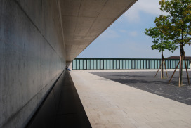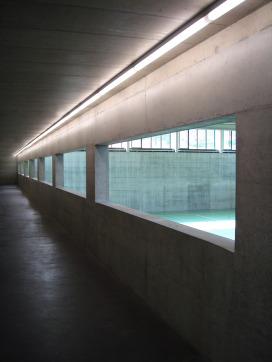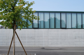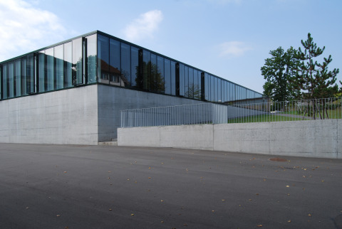 Als wichtige Querachse zwischen Bahnhofstrasse und Bleicherain bildet die Angelrainstrasse das Rückgrat der Schulanlage. Ihr entlang sind Bauten und Freiräume abwechselnd aufgereiht. Mit ihrer präzisen Position im Gesamtareal und mit der schlichten, ruhigen Architektur beansprucht die neue Halle eine angemessene, ortsbauliche Präsenz, ohne dabei die Altbauten zu bedrängen. Die natürliche Topografie wird durch Terrassenkanten akzentuiert. Auf der mittleren Ebene, zwischen alter und neuer Turnhalle, ist ein grossräumiger Pausenplatz aufgespannt, aus welchem der neue Hallenbau als laternenartiger Glaskörper hervorstösst. Ein schmales, langgestrecktes Nebengebäude (Geräteraum und gedeckter Pausenbereich) schliesst die Anlage am östlichen Rand und trennt sie von den Aussensportplätzen.