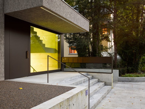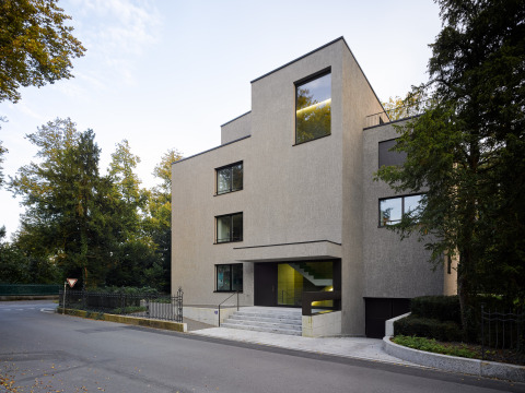 Das Mehrfamilienhaus befindet sich in einer von historischen Bauten und Gärten geprägten Umgebung. In Zusammenarbeit mit dem Hochbauamt und der Denkmalpflege wurde schrittweise ein Projekt entwickelt, das einerseits den hohen städtebaulichen Anforderungen gerecht wird und andererseits ein attraktives Wohnangebot ermöglicht. Zur Strasse hin ist der Baukörper durch einen Fassadenrücksprung vertikal betont. Das dominante Treppenhaus mit seinem grossen Fenster zitiert ein typisches Merkmal der umgebenden Villen. Der rindenartige, zweifarbige Verputz erzeugt eine Tiefenwirkung der Fassaden und integriert den Neubau auf zurückhaltende Weise in den Baumbestand und die angrenzenden Villen. Die vier Wohnungen sind jeweils um einen zentralen Eingangsraum organisiert und bieten durch verschiedene Höhenniveaus und freistehende Cheminéekörper spannungsvolle Raumbeziehungen.