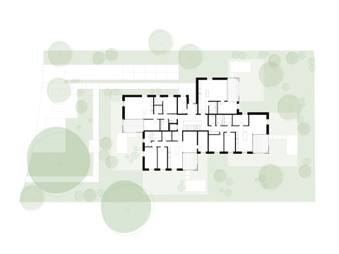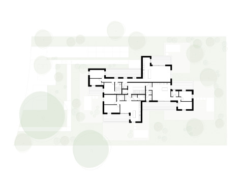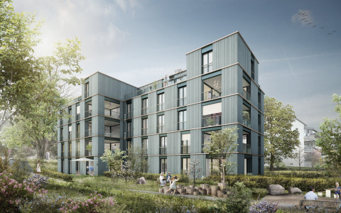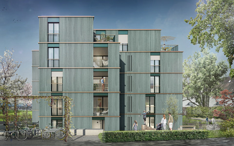 Das Grundstück liegt am Siedlungsrand von Uster und bietet eine attraktive Sicht in die weite, ebene Landschaft des Greifensees. Die Gebäudeform, die einem Windrad nachempfunden ist, gliedert das grosse Volumen und verwurzelt es besser in seine Umgebung. Der parkartige Garten mit seinem Baumbestand wird durch die Vor- und Rücksprünge der Fassaden räumlich zoniert und die Massstäblichkeit des Projektes nimmt Bezug zur nachbarschaftlichen Bebauung. Der windradförmige Grundriss des Gebäudes ermöglicht es, dass alle Wohnungen von attraktiven Aussichten profitieren. Die vier Wohnungen pro Geschoss sind um ein zentrales Treppenhaus gruppiert und belegen jeweils einen Gebäudeflügel. Somit gewinnen sie an Individualität und können dreiseitig belichtet werden. Die Loggias liegen jeweils an den Gebäudeecken und werden gestalterisch in die Gebäudehülle eingebunden. Das Attikageschoss ist vom Gebäudekörper zurückversetzt, springt aber an neuralgischen Gebäudeecken bündig zur Fassade vor und zeichnet eine spannungsvolle Silhouette. Die vier Gebäudeflügel werden durch die vertikalen Eckausbildungen zusätzlich betont und die Volumetrie wird dadurch noch plastischer. Die Fassaden werden geschossweise durch ein Kupfersims gegliedert, in denen sich vertikale Holzschalungen mit raumhohen Fenstern abwechseln.