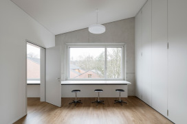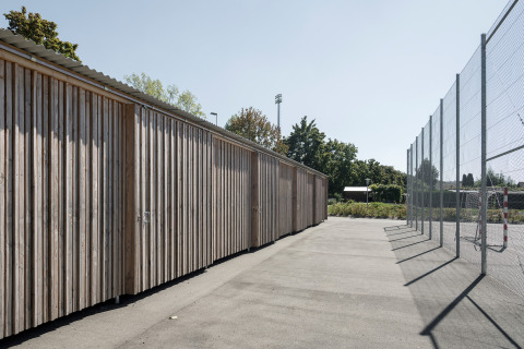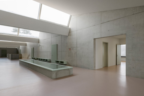 Das neue Schulhaus integriert sich auf selbstverständliche Weise in die Schulanlage aus den Fünfzigerjahren. Das niedrige Gebäudevolumen strickt das Bebauungsmuster der öffentlichen Gebäude im Schaffhauser Breitequartier weiter und nimmt das Thema der parallel ausgerichteten Dachformen auf. Die bestehende Pausenhalle konnte erhalten bleiben und verbindet den Neubau mit dem bestehenden Schulhaus. Das markante Sheddach ermöglicht im Obergeschoss Unterrichtsräume mit grosser Raumtiefe und verteilt das Tageslicht gleichmässig bis in den zentralen Erschliessungsraum. Im Erdgeschoss setzt sich die Topografie im Inneren des Gebäudes fort und schafft dadurch Bereiche mit unterschiedlichen Raumhöhen. Dank den beiden Eingängen lassen sich der Mehrzweckraum und die ausserschulischen Räume auch in Randzeiten unabhängig nutzen. Über den breiten, zentralen Erschliessungsraum werden alle Klassenzimmer und Werkräume erschlossen. Zwischen den Klassenzimmern sind die Gruppenräume angeordnet und können bei Bedarf zusammengeschlossen werden. Die Fassade ist mit einem mineralischen Kratzputz versehen. Verschiedene Farbflächen erzeugen zusammen mit den verspringenden Fenstern ein lockeres und verspieltes Erscheinungsbild.