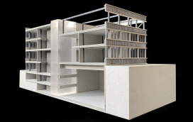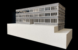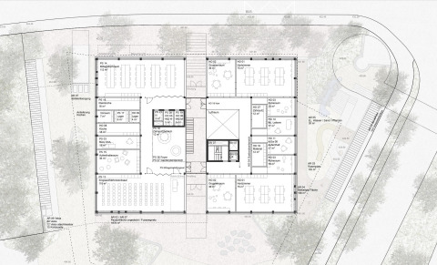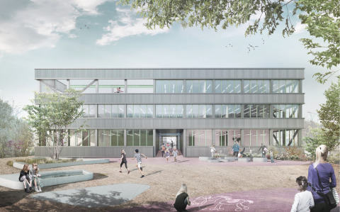Das Schulhaus bildet den Schlussstein und gleichzeitig die Eingangsadresse des neuen Quartiers Bülachguss. Die vorgeschlagene Setzung auf dem dreieckigen Baufeld erlaubt ein kompaktes Gebäudevolumen mit einem grossen Spielplatz für die Schule und das Quartier. Das Zugangsgeschoss wird durch den geneigten Vorplatz mit dem öffentlichen Raum verknüpft und verbindet über die Querachse im Erdgeschoss den Spielplatz mit der Strasse. Die leichte Erhöhung des Eingangsgeschosses erlaubt zudem einen separaten Zugang zum Kindergarten und eine natürliche Abgrenzung der zugehörigen Aussenanlage. Über diese wird gleichzeitig die Turnhalle von Osten her belichtet. Das Gebäude ist als Stahlbetonskelett mit Stützen, Decken und Kernen konstruiert. Die Raumeinteilung aus Leichtbauwänden kann unabhängig vom Raster erfolgen und hat keine statische Funktion. Die Fassade ist in vorfabrizierter Holzbauweise vorgesehen und betont durch die Verkleidung mit Aluminiumblech den industriellen Charakter der Anlage.