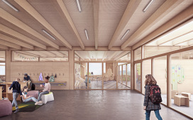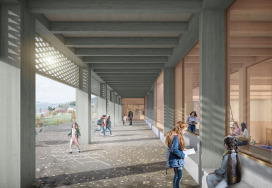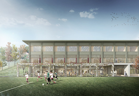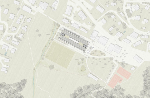Das Grundstück des Schulstandortes liegt am Dorfrand der St. Galler Gemeinde Eggersriet. Das neue Schulgebäude schliesst die Dorfbebauung gegen Süden hin ab und schafft eine prägnante Terrainkante. Der Aussenbereich, der Sportplatz und die Spielfläche liegen als Übergang zur Natur und zum Wald auf der Freifläche vor dem neuen Gebäuderiegel. Die längliche Ausbildung und die Einbettung in die Hanglage ermöglichen verschiedene Aussenbezüge. Die westlichen Erdgeschossräume profitieren von der Nähe zum offen gelegten Dorfbach. Zudem ermöglicht die Setzung eine grösstmögliche Flexibilität für zukünftige Weiterentwicklungen. Die Einbettung in die Geländekante lässt das Schulgebäude gegenüber den nördlichen Nachbarn eingeschossig erscheinen. Zum Schulaussenraum hin aber tritt das Schulhaus dreigeschossig in Erscheinung. Dies hat mehrere Vorteile. Die Nachbarn behalten weiterhin freie Sicht nach Süden, alle Geschosse des Schulhauses bekommen einen eigenen, direkten Aussenraum und das Gebäude dient als Lärmbarriere zum Wohnviertel hin.
