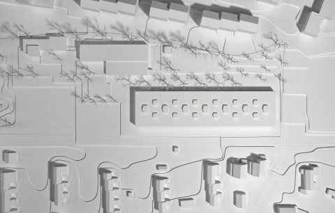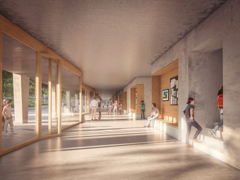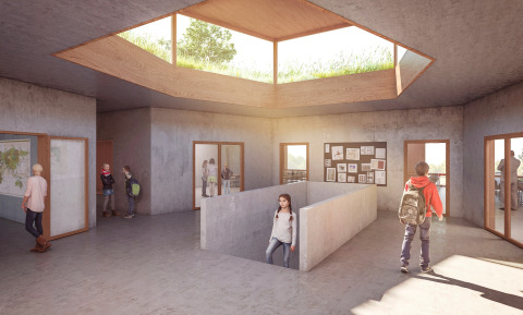 Die Schulanlage Wallrüti liegt in einem Parkgebiet, das sich vom Freibad Oberi bis zur Landwirtschaftszone erstreckt. Anstatt sich in die Höhe zu entwickeln nutzt das Schulhaus das grosse öffentliche Areal und verteilt die Nutzungen horizontal; somit entsteht eine Schule, die trotz ihrer Grösse eine räumlich kleinteilige Struktur aufweist und die Schülerströme aufgliedert. Das Erdgeschoss orientiert sich durch eine grosszügige Eingangshalle mit vorgelagerter Arkade auf den Pausenplatz. Die Eingangshalle organisiert die horizontale Verteilung im Gebäude und wird gleichzeitig zur zentralen Begegnungszone. Punktuell bohren sich Treppenaufgänge ins Obergeschoss, wo eine zellenartige Struktur das Unterrichtgeschoss in sieben Einheiten an je vier Klassenzimmern gliedert. Laternenartige Dachaufbauten bringen Tageslicht in die Gebäudemitte und unterstreichen die clusterartige Architektur.