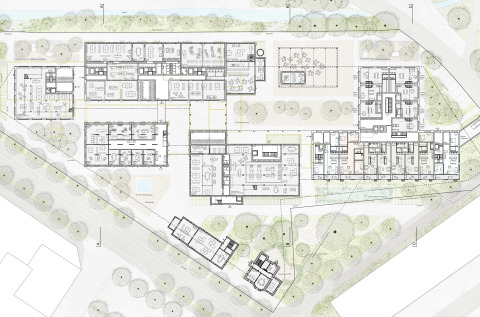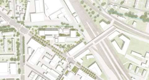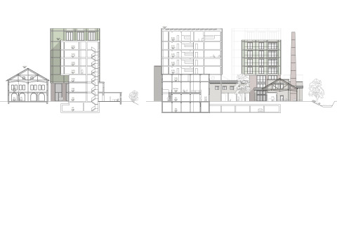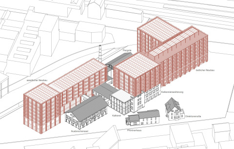 Das Projekt auf dem Areal der ehemaligen Gelatinefabrik sucht einen behutsamen Umgang mit dem Bestand. Er wird auf der einen Seite von störenden Verklebungen zugunsten von neuen Zugängen und Wegen befreit. Auf der anderen Seite wird er relativ direkt mit zwei neuen Baukomplexen im Westen und im Osten verschmolzen. Volumetrie und Setzung führen die orthogonale Ausrichtung der ehemaligen Produktionsanlage konsequent weiter zu einer prägnanten Überbauung. Drei Hochpunkte akzentuieren die Silhouette an den Zugängen sowie in der Mitte am neuen Platz zur Eulach. Dieser zentrale Raum öffnet das Areal zum Gewässer und wird mit dem Hochkamin und der Pergola des wiederverwendeten Dachstuhles zu einem stimmungsvollen Ort. Durch die Anordnung der Gebäude entsteht ein transparentes und vielseitig nutzbares Freiraumgefüge, das die Umgebung einbindet und ergänzt. Verbindendes Element auf Stadtebene ist das überhohe Erdgeschoss, das in etwa die Traufhöhe der Bestandesbauten aufnimmt und den Einbau eines Galeriegeschosses zulässt. Der Dichte und den Belichtungsverhältnissen in der Anlage folgend, sind im Erdgeschoss gewerbliche und gastronomische Nutzung angesiedelt, die eine Bespielung des öffentlichen Aussenraums erwarten lassen.