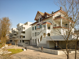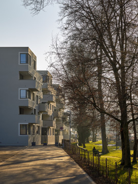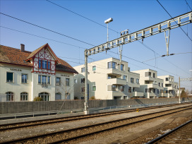 Das Areal „Tanner“ beim Bahnhof Frauenfeld ist durch das Gleisfeld und den Murg-Flussraum mit dem Lindenpark gefasst. Eine an den Bahndamm gerückte Autoeinstellhalle bildet den Sockel für drei aufgesetzte, quaderförmige Wohnhäuser. Deren Zwischenräume gewährleisten die Durchsicht von den Bahnanlagen zum Park. Gegenüber der flussseitigen Fassadenflucht ist der eingeschossige Sockelbau deutlich zurückgesetzt, sodass die für das Areal typische Geländekante lesbar bleibt. Pro Geschoss sind zwei Wohnungen so angeordnet, dass sie wechselseitige Ausblicke auf den Stadtkern und den Lindenpark bieten. Die halb eingezogenen, versetzt angeordneten Balkone ergeben ein lebhaftes, aber kontrolliertes Fassadenbild, welches die bewegte Volumetrie des Altbaus in neuer Form aufnimmt.