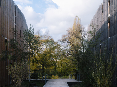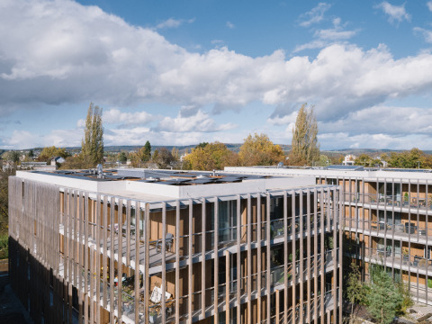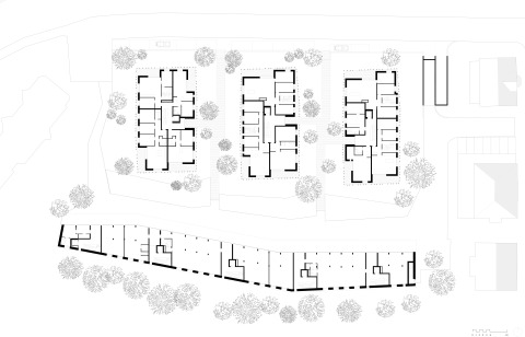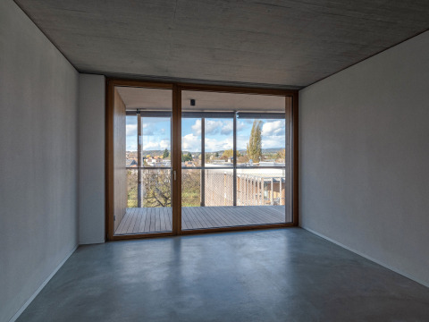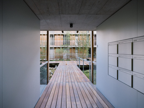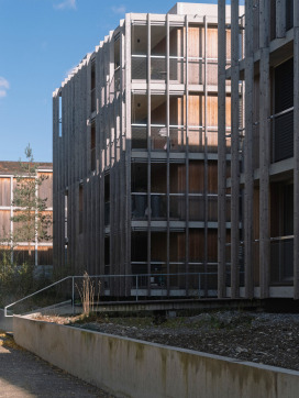 Die Baufirma Ernst Herzog verlegt ihren Werkhof an den Stadtrand von Frauenfeld. Auf dem frei werdenden Areal nahe beim Bahnhof entsteht eine neue Wohnsiedlung mit zweiundachtzig Wohnungen. Das Baufeld liegt zwischen der Bahnlinie und dem Flussraum der Murg. Gegen das Gleisfeld hin schliesst ein langer Gebäuderiegel den Raum ab, während zum Fluss hin drei locker gesetzte Punktbauten den Grünraum in die Überbauung hineinfliessen lassen. Die angrenzenden Nachbargebäude werden in die Anlage miteinbezogen. Eine ausgewogene Gliederung lässt bestehende und neue Bauten an den hohen Qualitäten der Aussenräume teilnehmen. Die Freiraumgestaltung lebt von der für einen Flussraum typischen Vegetation und den grosszügigen Ruderalflächen. Eng mit der Umgebung verknüpft ist auch die Fassadengestaltung. Durch die umlaufenden Balkonschichten, die als Filter zwischen innen und aussen funktionieren, erhalten die Gebäude einen offenporigen Charakter. Die Materialien Holz und Beton unterstreichen den naturnahen und rohen Charakter der Siedlung. Durch die gleichartige Fassadengestaltung aller vier Gebäude wird die Wohnsiedlung als Einheit wahrgenommen, kann aber dennoch auf die verschiedenen Ausrichtungen Rücksicht nehmen.